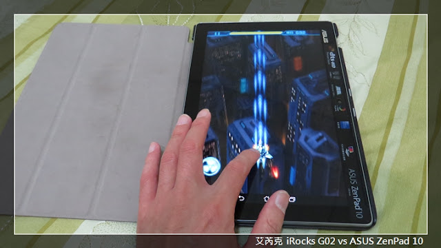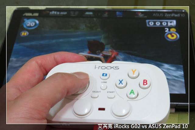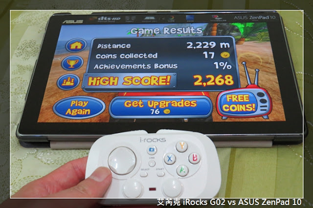 ▲ 使用i-Rocks G02的實體按鍵來操控遊戲,比起體感操作來說,i-Rocks G02其方向與準度皆準確許多,遊戲分數達到2229公尺,比起使用體感操作距離增加了70%。▲ 艾芮克 i-Rocks G02 迷你無線藍牙遊戲手柄支援Android & Windows 兩大平台,搭配大尺寸Zenpad 10進行遊戲,具備絕佳聲光效果且體驗感受更豐富。