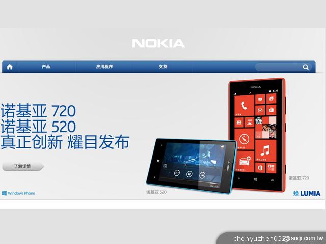 諾基亞於 3 月 26 日在中國舉行新機上市發表會,推出 NOKIA Lumia 520 / 720 兩款 WP8 中階智慧型手機,此次推出的這兩款設備皆為定製版本,分別是中國移動(TD-SCDMA)定製版本 NOKIA Lumia 520T / 720T 和中國聯通(WCDMA)定製版本 NOKIA Lumia 520 / 720。這四款手機皆提供黑、白、藍、黃、紅 5 種顏色可供選擇。NOKIA Lumia 520/520T 的空機售價為 1,299 元人民幣(約新台幣 6,245 元),NOKIA Lumia 720 / 720T 的空機售價則為 2,499 元人民幣(約新台幣 12,015 元),相關的合約售價官方目前尚未公佈,此四款設備預計將於 4 月正式鋪貨。