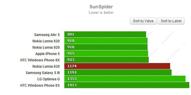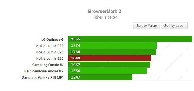 先前,科技資訊網站 GSMArena 透過跑分測試軟體 SunSpider 與 BrowserMark 2 對包括 NOKIA Lumia 620、HTC 8S、SAMSUNG GALAXY S III i9300 在內的多款智慧型手機進行瀏覽器性能測試,測試結果 NOKIA Lumia 620 的成績表現優異,甚至勝過了 HTC 8S 及 SAMSUNG GALAXY S III i9300。在規格配置上,NOKIA Lumia 620 與 HTC 8S 同樣採用 800 x 480pixels 螢幕解析度的螢幕,運行 Windows Phone 8 作業系統,內建 Qualcomm S4 Plus, 1GHz 雙核心處理器、500 萬畫素相機鏡頭。NOKIA Lumia 620 配置 512MB RAM / 8GB ROM,HTC 8S 則內建 512MB RAM / 4GB ROM,兩款手機配置十分相近。而 SAMSUNG GALAXY S III i9300 是 SAMSUNG 公司 2012 年的旗艦機種,採用 Android 4.0 作業系統,規格配置均比 NOKIA Lumia 620 強悍,但其瀏覽器測試表現卻不如 NOKIA Lumia 620。雖然瀏覽器效能並不代表手機的整體效能,不過如此優異的表現依然令人印象深刻。