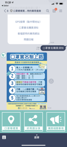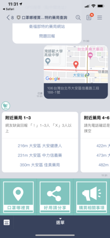 下方有三個選項「口罩哪裡買」、「好用請分享」和「購買相關事項」,點選口罩哪裡買後,就可以選擇透過「GPS 搜尋」所在地附近的藥局,此時機器人就會回傳所在地附近的所有藥局,如果有口罩短缺的情況,也可以透過回傳「!」回報喔
