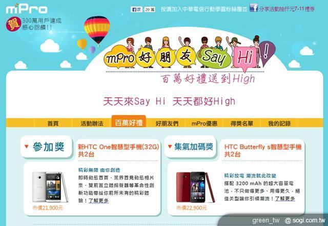 中華電信一向致力於傾聽客戶的需求,提供優質的上網與加值服務,為提昇 mPro 資費的多元性滿足更多客戶的需求,新增 mPro 550 型及 mPro 650 型資費,並於國內首創提供上網用量簡訊通知服務,幫助客戶輕鬆控管上網費用,提供客戶安心的手機上網服務!本次活動回饋 mPro 全資費客戶,凡 mPro 客戶至活動網站完成簡單的「Say Hi」步驟,就有機會把超熱門的新 hTC One 手機帶回家,參與「Say Hi」人次破 10 萬及 20 萬分別加碼抽 hTC Butterfly s 新款智慧手機!