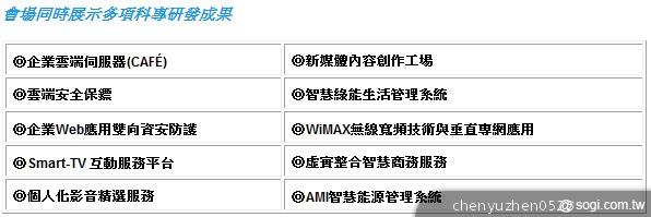 展出內容包括針對企業級需求開發,包括主機雲、桌面雲、儲存雲等三大模組的「企業雲端伺服器」;可解決日益嚴重的資安問題的「Web 網路應用安全防護」與「雲端虛擬監控」,以及支援無線通訊環境的「WiMAX無線寬頻技術與垂直專網應用」。