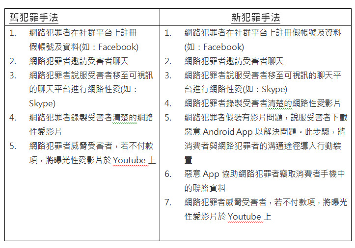 趨勢科技發現,此攻擊最初來源於中國的不法集團,不法分子透過社交平台如臉書 (Facebook) 對網友展開引誘,當受害者以為兩情相悅地拍下私密影片後,不法犯罪集團會以電腦軟體出現問題為藉口,要求受害者下載可竊取個資之惡意 App,詐騙集團可輕易地取得受害者的通訊錄資訊,藉此要脅受害人給付贖金;如不支付則將曝光私密影片於網路平台,並發送給親朋好友。目前亞太區已有不少韓國及日本民眾受害,已知的案例中被要求支付韓幣 1 百萬元 (美金 908.02) 贖金,亞太區鄰近地區的台灣民眾有可能成為犯罪集團下一波攻擊目標,需更加留心。