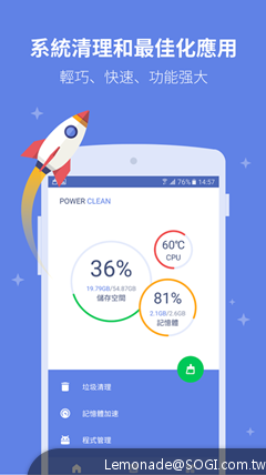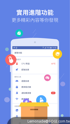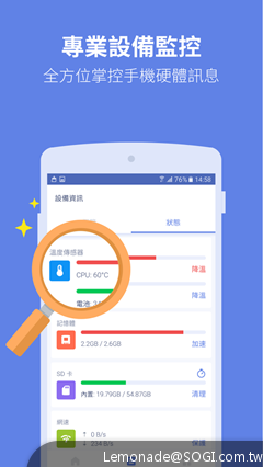 持續監測溫度變化,偵測大量耗用CPU的應用程式並開始降溫程序,有效降低手機溫度。利用記憶體加速,盡快為Android的裝置降溫。
