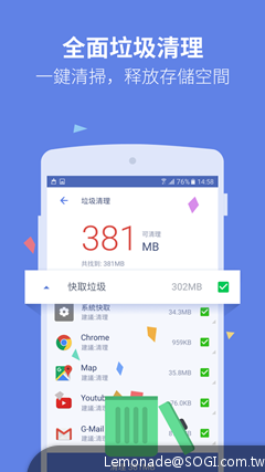 例如:殘留的檔案,快取,暫存檔,APK無用的及其他大型檔案。