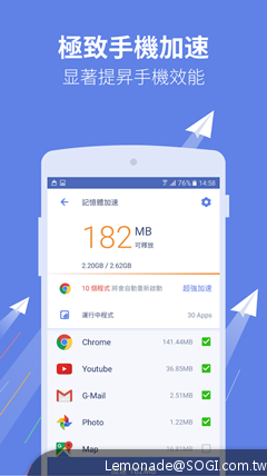 移除多餘的背景工作,藉以清理記憶體(RAM)並最佳化手機速度。