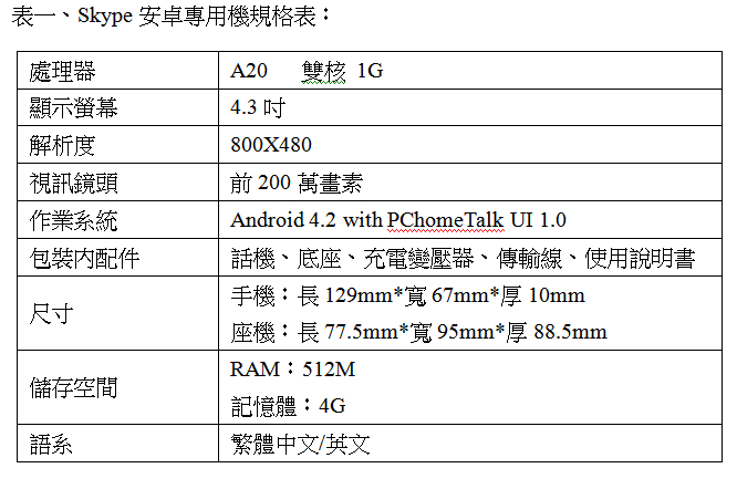 「Skype 安卓專用機」即日起在 PChome24h 購物、PChome 全球購物、及 PChomeUS Online Shopping 獨家開賣,首賣震撼價只要 1,990 元,加贈 35 分鐘 Skype 點數,用戶可隨時撥打 Skype 電話至全球 300 多個國家 / 地區。