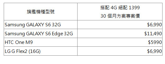 - 「防護雙重好禮」需新申辦 / 攜碼 / 白金會員續約申辦 4G 絕配 1399 以上資費方案並搭配 Samsung GALAXY S6 /S6 edge、HTC M9、LG G Flex 2,簽約 24/30 個月方適用,係指: (1) 免費手機防護服務 APP(電話簿備份、遠端保護及防毒),合約到期後未取消,將恢復收取 $20 月租費及兒少防護網 $10 月租費。該服務若有調整 / 異動 / 停止,無須預告或個別通知 (2) 抗藍光保貼於 2015/6/30 前郵寄至客戶帳單地址。
