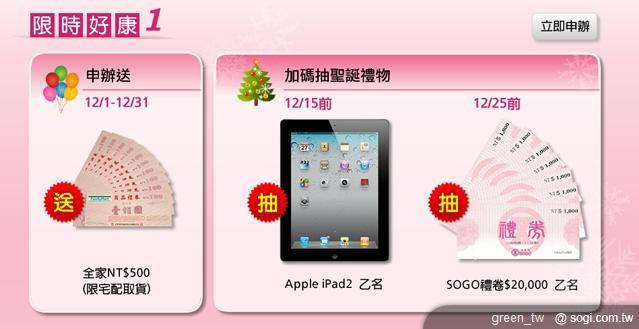 好康 1:凡於網路門市申辦成功同時選擇宅配取貨,即送全家便利商店 500 元禮券,再抽 Apple iPad 2、SOGO 禮券等聖誕禮物!