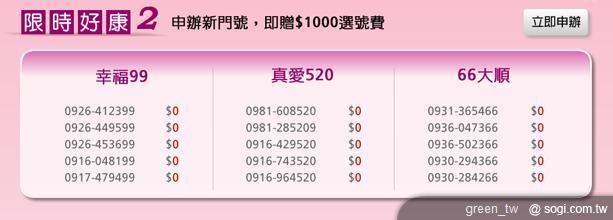 本活動獎項以公佈於本網站上的資料為準。參加者每一門號僅有一次得獎機會。參加者如因參加本活動或因活動獎項而遭受任何損失,遠傳網路門市不負任何責任,一旦得獎者領取獎品後,若有遺失或被竊,遠傳網路門市不發給任何證明或補償。獎品不得轉換、轉讓或折換現金。若原定獎項因不可抗拒之因素無法提供,得獎者同意主辦單位另以等值之獎品替代之,不得要求折現或轉換其他商品。依稅法規定,中獎金額超過 NT$20,000 元,須負擔 10% 機會中獎稅;非中華民國境內居住之個人(即在中華民國境內居住未達 183 天之本國人及外國人)不論得獎人所得之金額,須就中獎所得扣繳 20% 機會中獎稅。參加本年度活動之中獎人(若為中華民國境內居住之個人)中獎金額超過新台幣 1,000 元(含)以上,本公司將依各類所得扣繳率標準就機會中獎所得代為申報,並於次年度寄發所得稅扣繳憑單。 - 開運門號折千元係指活動期間於網路門市申辦新門號,即贈送選號費 1000 元,限 2011/12/1 - 2011/12/31 前於網路門市申辦新門號單門號或手機方案,合約 24 個月。選號費折扣金額限抵扣選號費,不包含月租費、通話費、國際漫遊、國際長途電話、特殊撥號、簡訊及加值服務。若遇扣抵金額生效時已停機或退租恕無法繼續享有選號費折扣優惠。以上選號費折扣,由啟用後第一個月帳單折扣,若申辦無收費門號,則無法適用此優惠。此折扣最多將選號費用折抵至 0 元。