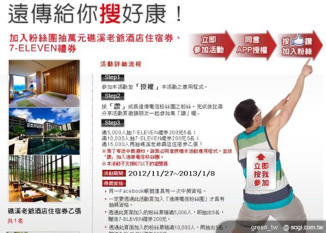 除了遠傳 FETnet 網站會員可享跨年好康活動外,還有超值好禮只給遠傳電信的粉絲們!即日起到 2013/1/8,只要透過專屬活動網頁「遠傳給你搜好康」,按讚加入「遠傳電信粉絲團」,就有機會獲得礁溪老爺酒店住宿券及 7-ELEVEN 禮券。遠傳 FETnet 一口氣推出眾多優惠活動,陪伴會員嗨翻跨年,不限遠傳電信用戶,都可加入 FETnet 會員享受好康,會員中心還有更多好康優惠等你來搜(http://www.fetnet.net/FETnet/membercenter.html)。