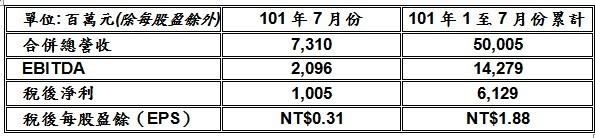 遠傳電信(股票代碼:4904)今(10日)公佈其101年7月份自結營利概況。7月份遠傳合併總營收為新台幣73.10億元,合併EBITDA與稅後淨利分別為新台幣20.96億元與新台幣10.05億元,稅後每股盈餘 (EPS)為新台幣0.31元。