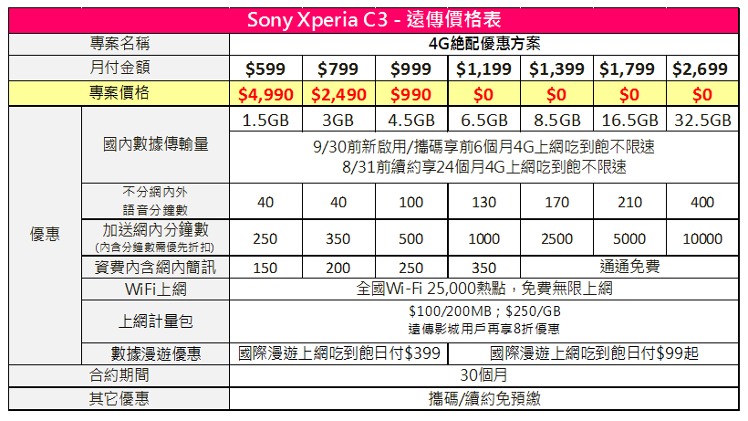 遠傳電信 Sony Xperia C3 4G 絶配優惠方案