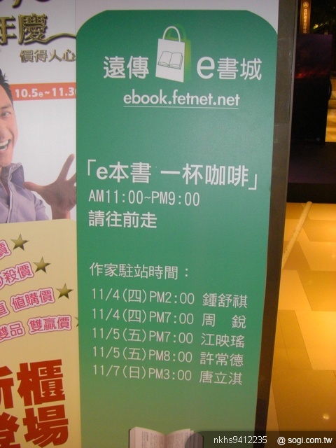 遠傳 e 書城將於 11 月 4 日至 11 月7 日連續四天於台北京站時尚廣場,舉辦遠傳 e 書城「e 本書,一杯咖啡」活動。現場除讓民眾邊享用咖啡邊親身體驗在 Samsung Galaxy Tab、View Sonic ViewPad 7、iPad 等各式平板電腦上,閱讀電子書的全新感受外,同時也特別邀請偶像歌手鍾舒祺,知名童話作家周銳、音樂才子許常德、兩性作家江映瑤、及星座專家唐立淇等多位作家蒞臨現場,與民眾分享新書及互動交流。