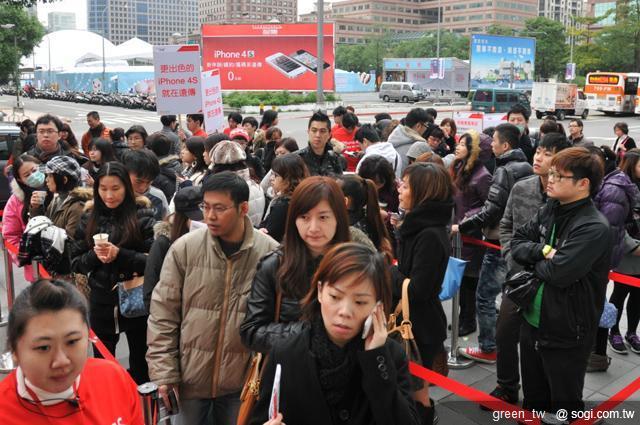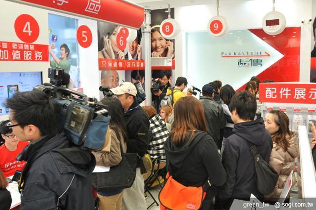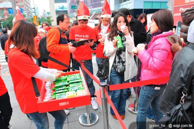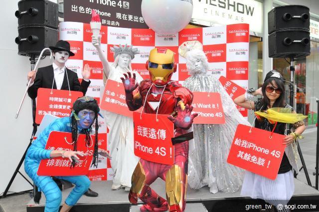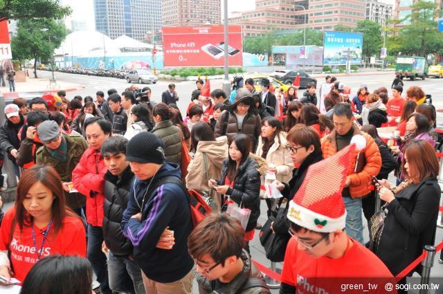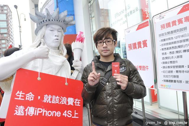 在眾人期盼聲中,iPhone 4S 於今日正式開賣。有別於以往凌晨跨夜開賣,今年遠傳在考量天候不穩定的情形下,安排於 12 月 16 日早上九點整,於全省遠傳及全虹等 550 個特定門巿同步開賣。但位於信義計劃區的威秀門巿,依舊熱鬧滾滾,連 Lady Gaga、自由女神、鋼鐵人、阿凡達、卓別林和冰雪女王都在寒風中穿越時空,帶動現場熱鬧氣氛。排隊行列中第一位消費者陳彥綸先生清晨 6 點即到現場等待,僅 18 歲的他還是學生,這次是第一次購買 iPhone 產品,存錢半年終獲 iPhone 4S 的那一刻興奮的大聲歡呼。