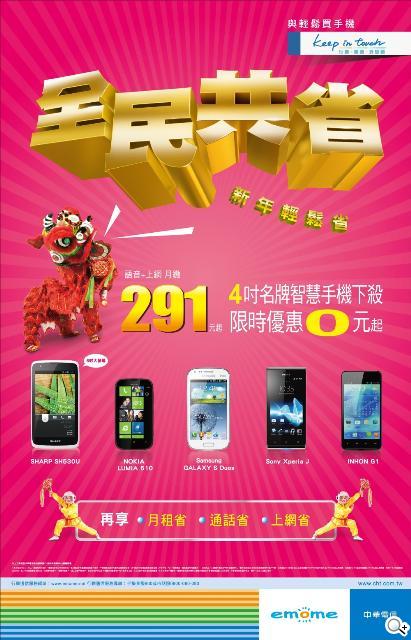 中華電信與你歡慶小龍年,新年換新機的超值優惠好康報給你!現在加入全民共省新年方案,即可立即擁有上網超低月租以及 4 吋名牌智慧手機等限時優惠喔!讓你在新年打電話拜年、寄送賀年祝福無往不利、快速又方便。如此超值的優惠,你還在等甚麼呢!