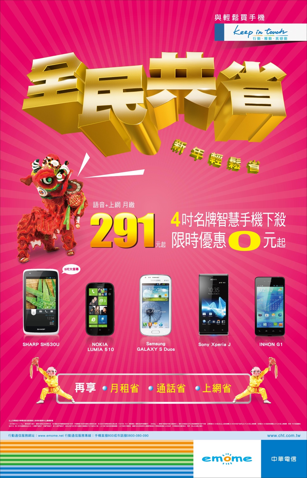 精選 20 款最低 0 元起的智慧型手機,高中低階機型一應俱全,主打 4 吋以上大螢幕 (其中 INHON G1 4 吋雙核智慧型手機,只要 0 元;LG L5、Huawei G300、Gsmart GS202 等 500 萬畫素大螢幕熱銷手機也都只要 1,490 元。),首年語音加上網超低月租只要 291 元,讓消費者過新年換新機,輕鬆悠遊智慧行動生活!