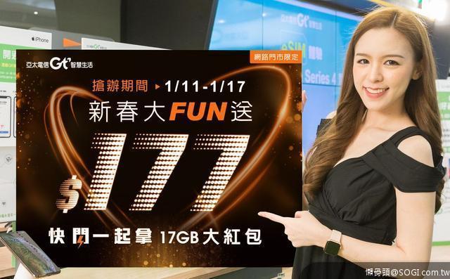 亞太電信網路門市迎新年,流量大紅包加碼震撼送!月租177元升級享「17GB免費飆網+輕速吃到飽」超殺優惠,限時7天全民都能領紅包討吉利,博個彩頭過好年。
