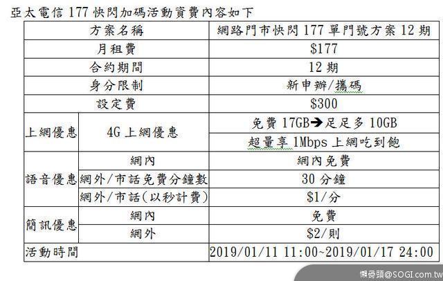網路門市快閃177流量紅包加碼送活動,自2019/01/11(星期五) 11:00開始搶辦,限時7天至2019/01/17(星期四) 24:00為止,凡新申辦/攜碼申辦成功,即享每月17GB免費上網流量,超量再享1Mbps上網吃到飽,網外/市話30分鐘免費打,網內通通免費,超量每分鐘只要1塊錢,絕對是金豬年假打發時間、賀歲拜年神器。
