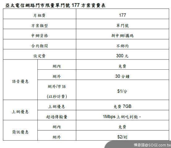 亞太電信網路門市的限量177方案,每月高達免費7GB的免費傳輸量,相較目前市場行情絕對有競爭力,數量有限只有7,777門,要辦要快,歡迎加入亞太電信。