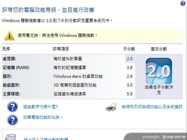 ▲ViewSonic ViewPad 10Pro 的 Windows 體驗分數為 2.0。