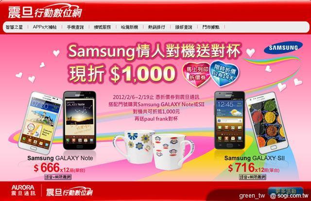 Samsung 智慧旗艦機優惠來嘍!「Samsung 情人對機送對杯 現折 $1000」活動期間 2012/2/6 起至 2/19 止,只有 14 天,到震旦通訊搭配門號購買 Samsung GALAXY S II 或 Note,憑折價券對機共可折現金 1000 元,再送大嘴猴潮牌對杯!