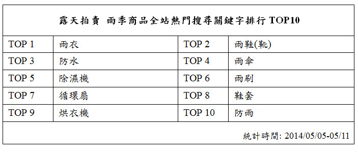 梅雨季報到後,和雨季相關之生活、家電與男女裝商品的網購業績暴增!台灣最大最熱絡的網路交易市場─露天市集發現,最近一週露天全站的雨季相關商品業績已較平日激增 70%↑。同時公布雨季商品熱門搜尋關鍵字排行,「雨衣」這組關鍵字不但拿下 NO.1,還擠進露天全站單週搜尋量的前 10 名;「雨鞋、防水」則分居二、三名。家電類的除濕機、循環扇和烘衣機也進榜;有趣的是,開車族在梅雨季時更換雨刷需求大增,「雨刷」拿下第六。