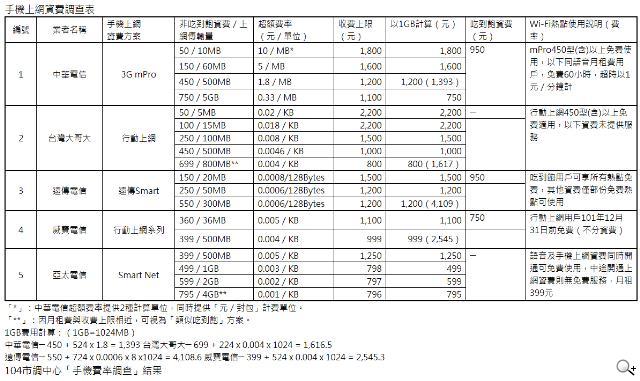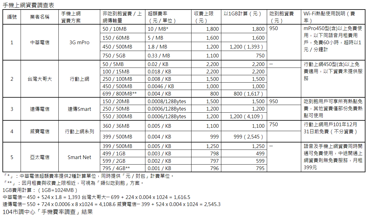 (1)中華電信 -3G mPro 的「450 元傳輸量 500MB」收費上限為 1,200 元,若按超額費率計算使用 1GB 之費用,總計為 1,393 元。(2)台灣大哥大 - 行動上網的「699 元傳輸量 800MB」收費上限為 800 元,按使用 1GB 傳輸量計算,總計為 1,617 元。(3)遠傳電信 - 遠傳 Smart 的「550 元傳輸量 300MB」收費上限為 1,200 元,按使用 1GB 傳輸量計價為 4,109 元,(4)威寶電信 - 行動上網系列的「399 元傳輸量 500MB」收費上限為 999 元,按使用 1GB 傳輸量計價則為 2,545 元。