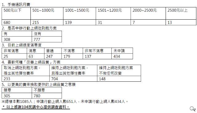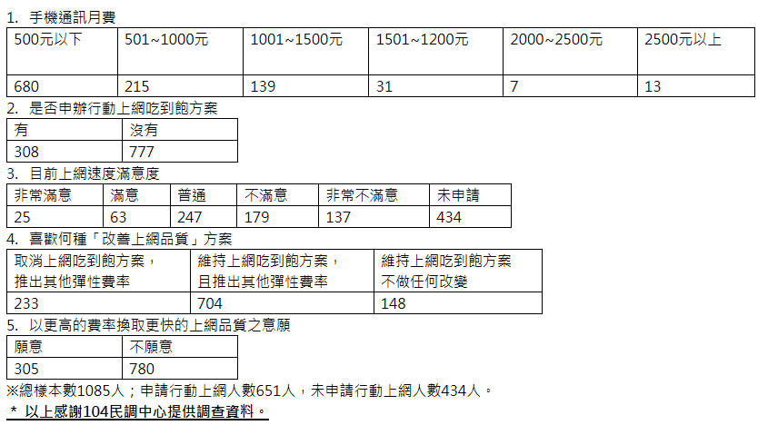 由此可見,消費者可選擇的範圍多在傳輸量 500MB 以下,基本上消費者的選擇不多,容易造成必須選擇吃到飽方案,即使消費者需求量不需吃到飽方案如此大,還是支付了吃到飽的費用,對消費者顯不公平。104 市調中心的數據也顯示,65%的民眾支持「維持上網吃到飽方案,且推出其他彈性費率」,表示有過半數民眾希望業者能提供更多的上網費率供選擇,並且不希望取消吃到飽方案!
