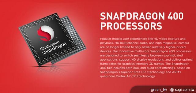 美國高通技術公司全新 Snapdragon 400 系列處理器以之前的產品為基礎,將繼續支援雙卡雙待、雙卡雙通的多 SIM 卡能力,提供流暢且圖像豐富的最佳化遊戲體驗,同時可支援多媒體內容無線串流的 MiracastTM 技術。此平台亦支援多種無線連線功能,包括整合 Qualcomm VIVETM 802.11ac Wi-Fi、藍牙、FM 與 NFC 技術;此平台還提供差異化功能組合,包括支援最新的 Android 與 Windows Phone 8 軟體;此外,亦可支援 QuickCharge 1.0,其充電速度較傳統充電方式快達 40%。