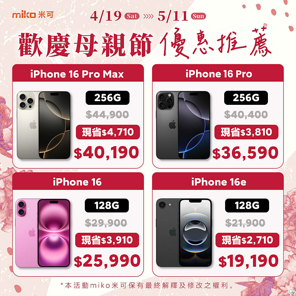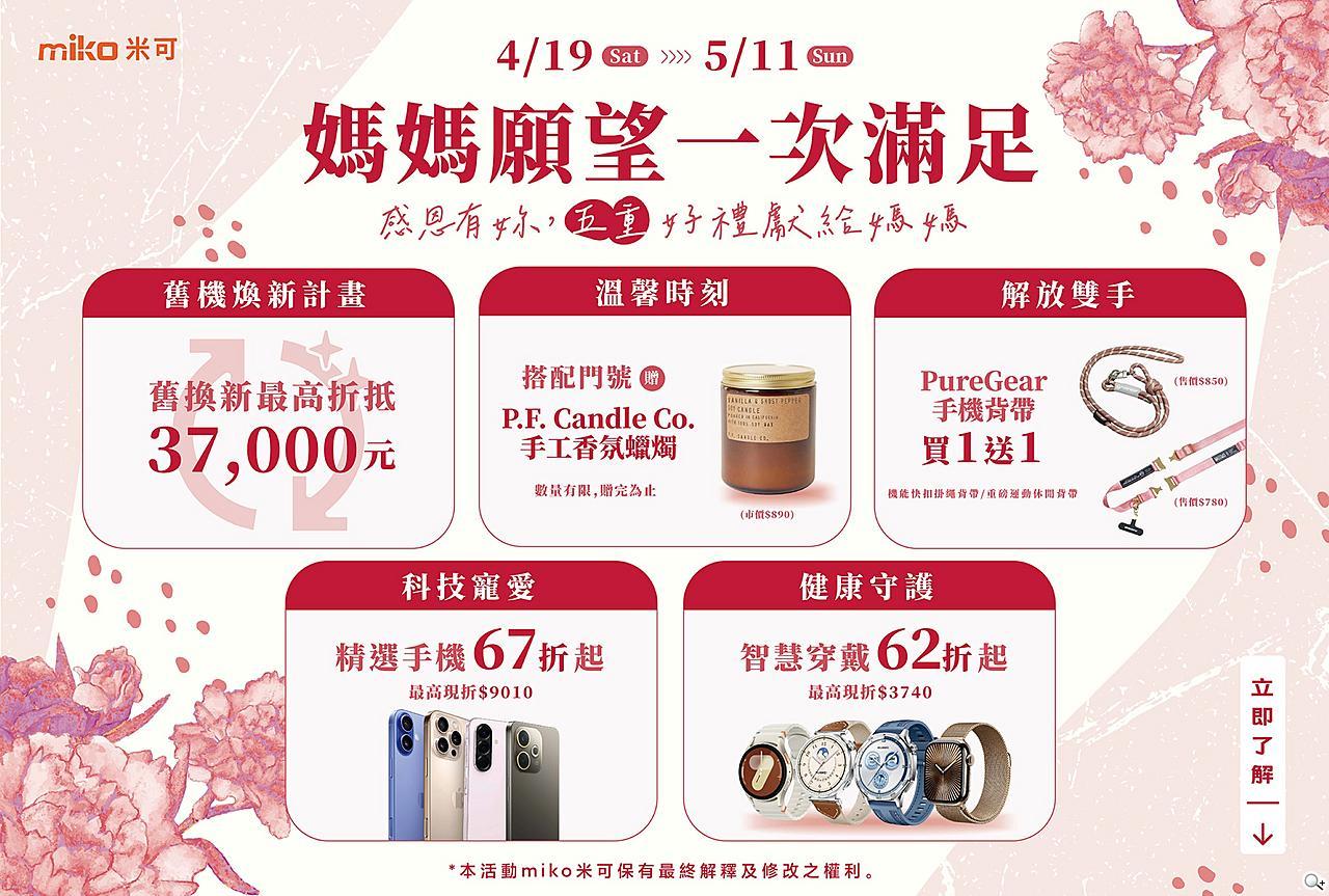 「媽媽願望一次滿足」五重好禮專案將持續至5月11日,數量有限,售完為止。消費者可至全台米可手機館門市或透過官方LINE@線上真人客服了解更多活動詳情。