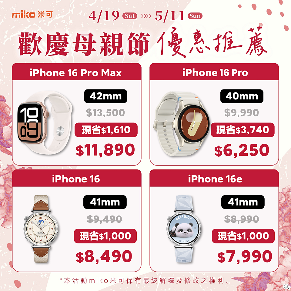 針對關注健康的消費者,米可手機館也推出智慧穿戴裝置優惠,最低66折起。Samsung Galaxy Watch7藍牙版40mm原價9,990元,特價僅需6,250元,下殺62折,現省3,740元;Apple Watch Series 10 GPS 42mm原價13,500元,特價11,890元,現省1,610元;HUAWEI Watch GT5系列也有多款優惠選擇,讓科技守護媽媽的健康。