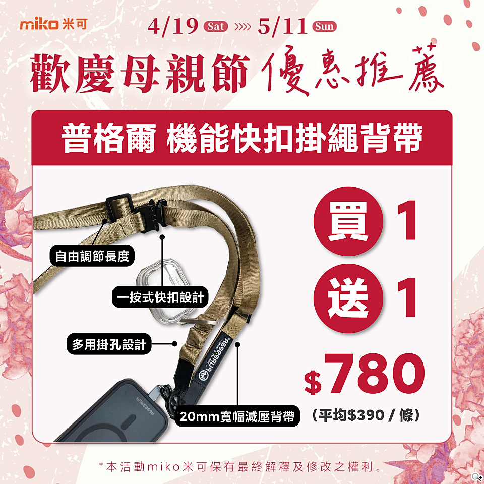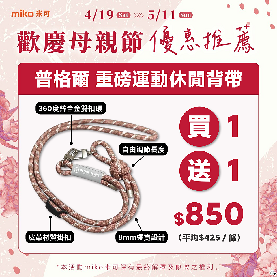 本次活動首重「溫馨體驗」,消費者凡於活動期間至全台32間米可手機館門市申辦門號,即可獲贈市價890元的P.F. Candle Co.手工香氛蠟燭,為媽媽打造專屬放鬆時光。此外,活動期間PureGear手機背帶推出買一送一優惠,平均每條僅需390元,時尚實用的設計讓媽媽購物、帶小孩或外出時都能解放雙手,同時保護心愛的手機。