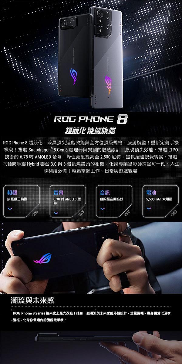 ROG Phone 8 超競化,兼具頂尖遊戲效能與全方位頂級規格,凌駕旗艦!重新定義手機樣貌!搭載 Snapdragon 8 Gen 3 處理器與獨創的散熱設計,展現頂尖效能。搭載 LTPO 技術的 6.78 吋 AMOLED 螢幕,峰值亮度提高至 2,500 尼特,提供絕佳視覺饗宴。搭載六軸防手震 Hybrid 雲台 3.0 與 3 倍長焦鏡頭的相機,化身專業攝影師捕捉每一刻。人生勝利組必備!輕鬆掌握工作、日常與遊戲戰場!
