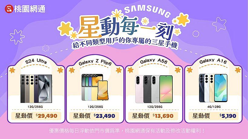 桃園網通精選四款熱銷話題機型,從 Galaxy S24 Ultra、A56、A16,到新一代 Galaxy Z Flip6,全面滿足不同族群的需求。現在就是換機最佳時機,歡迎親臨門市了解更多,讓屬於你的「星動時刻」就此展開!