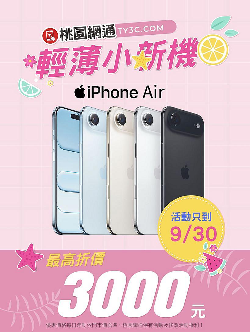 即日起至 9/30,來桃園網通搶購,空機價最高現折 3,000 元,再搭配舊換新活動可加碼折抵 1,000 元(不含回收價值),入手新機就是現在!