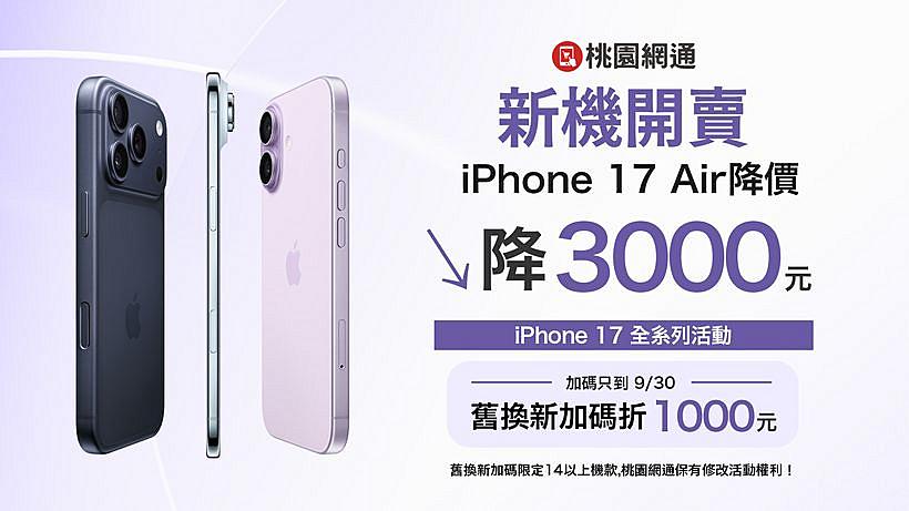 還不快來桃園網通!即日起至 9 月 30 日止,iPhone 17 Air|不限顏色 空機價最高可現折 3,000 元,搭配舊換新活動還能再加碼折抵 1,000 元(不含手機回收價值),讓消費者能以更優惠的價格搶先入手!
