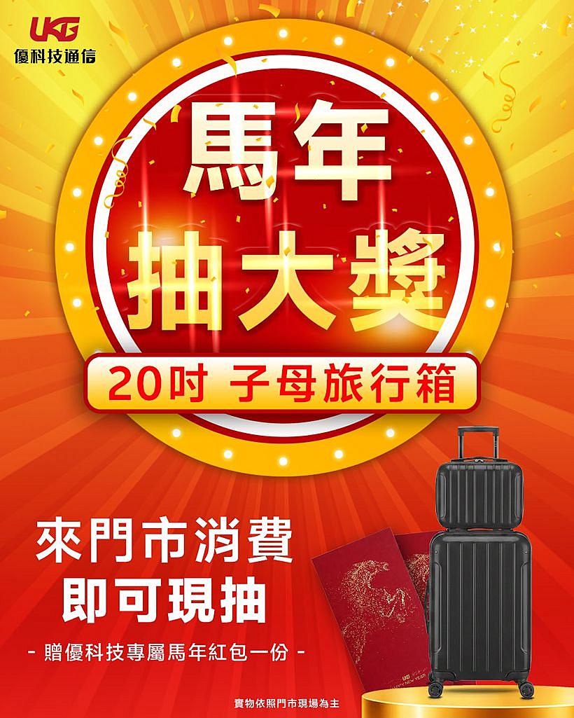 - 馬年紅包與行李箱抽獎活動需於活動期間內至門市消費不限金額方可參加,抽獎需加入官方LINE並透過數位抽獎券進行。
