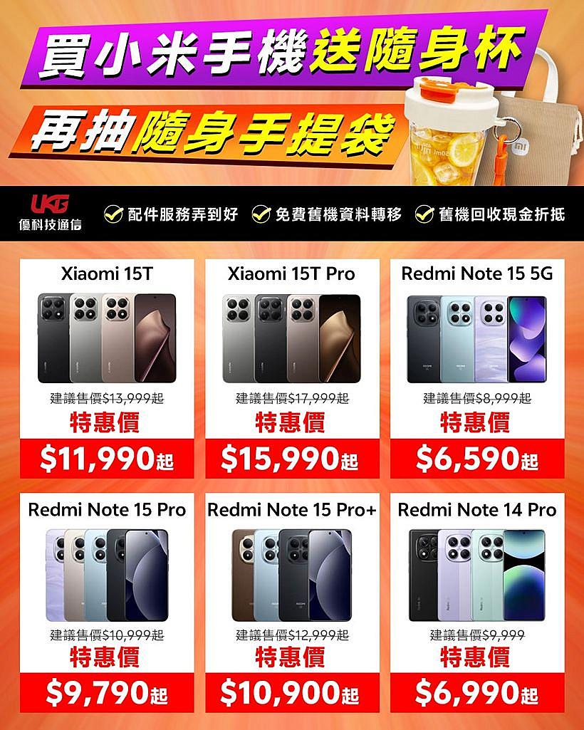 優編幫大家爭取到最實在的小米、紅米換機優惠。現在來 UKG 優科技通信,不管是最新旗艦 Xiaomi 15T 系列,還是高 CP 值的 Redmi Note 15 系列,通通享有挑戰全國最低的特惠價!