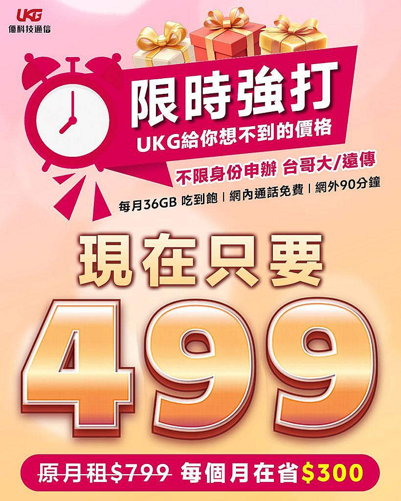 UKG 優科技通信 3 月份強勢出擊,就是要幫您把預算花在刀口上!原價 $799 的 5G 優質方案,現在限時回饋只要 $499!