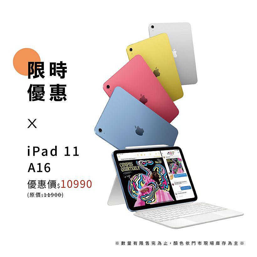 iPad 11 (128G WiFi版) 多色炫彩登場!輕巧設計,超強效能,無論學習、娛樂還是工作,樣樣出色!現在只要$10,990(原價$11,900),超值破盤,錯過不再!數量有限,售完即止!顏色依現場庫存為主,心動就要快,手刀入手,搶先擁有你的全新iPad!