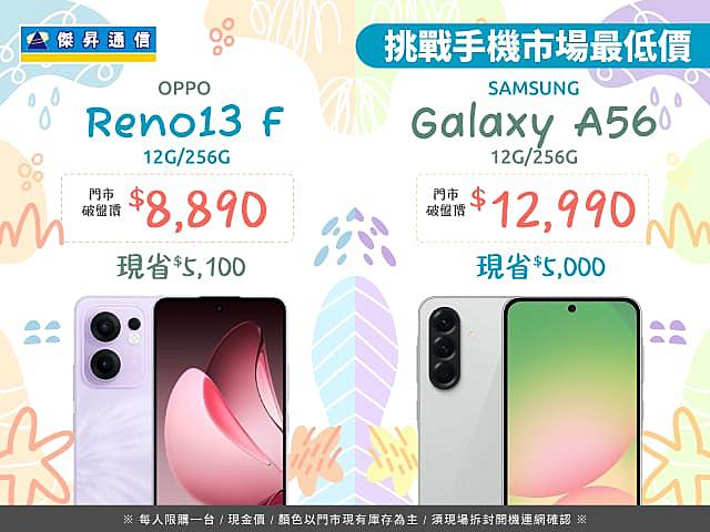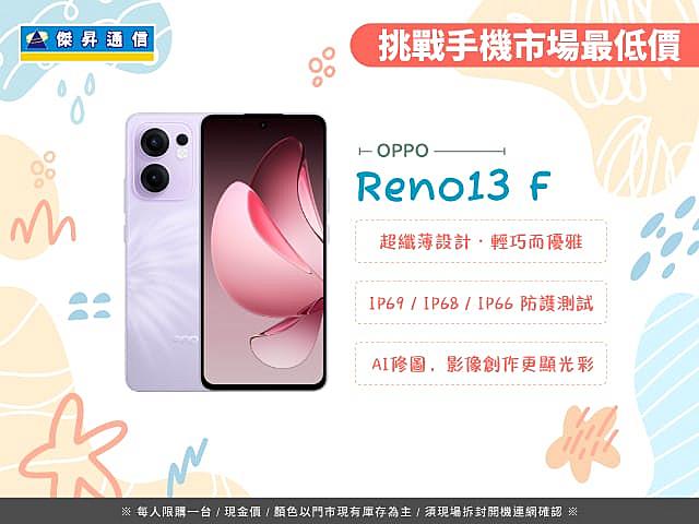 - OPPO Reno13 F (12G/256G) 不限色 $8,890