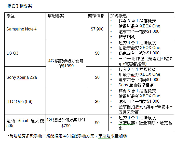 - 展場限定加碼最高再送遠百禮券 $1,500,係指申辦 4G 絕配 1399 以上手機方案,加送遠百四合一禮券 $1,000。攜碼用戶全面再加碼遠百四合一禮券 $500。攜碼所贈送之禮券 $500、LG G3 & LG Wine Smart 之三合一配件包 )、Sony Z2a 之 Sony 原廠行動電源以及 XBOX One,遠傳將在所有活動場次結束後,確認用戶申辦成功資格之 45 天後寄出。