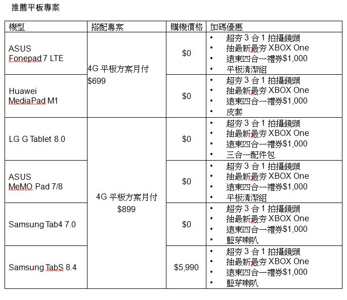 - 「新朋友申辦 / 老客戶續約 三星 4G 平板加碼折 $1,000」限新申辦 / 續約 Samsung Tab4 7.0/ Samsung TabS 8.4/ Samsung TabS 10.5/Apple iPad Air 2/Apple iPad mini 3 搭配遠傳 4G 高速飆網 699 以上費率並簽約 24 或 36 個月,專案價最低折抵至 $0 止,不得要求兌換現金或更換贈品。新朋友係指申辦當時未擁有遠傳月租型門號之用戶。