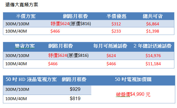 - 申辦半價方案需簽 26 個月,本方案合約期間內若提前退租、變更方案、降速或 ADSL 與光纖互換者需繳交違約金 4,000 元,按剩餘約期天數比例計算。