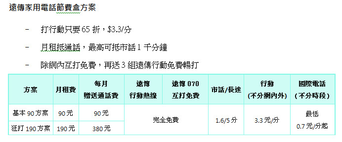 - 申請狂打 190 方案需簽約二年,合約期間「遠傳 070」服務月租費 190 元可抵 380 元通話費,免費租用『遠傳家用電話節費盒』設備。提前退租 (含違約或違反法令遭致停機者),需補繳 2,500 元之違約金予新世紀資通 (股) 公司 (違約金按剩餘約期天數比例計算)。合約期滿後月租費為 190 元,可抵 380 元通話費用 (通話費皆限當月抵用不可遞延或折現)