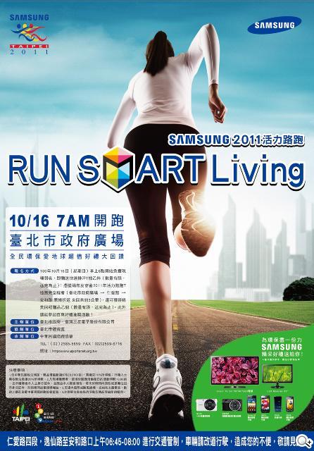 【2011 年 10 月 13 日,台北訊】台灣三星電子今年度將第六年在台舉辦三星活力路跑活動並以《Run!Smart Living》為主題,透過路跑活動響應智慧科技所帶來的新生活理念。