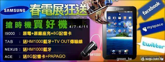 Samsung 洞察消費者在景氣回溫狀況下,對於每一分錢更加精打細算的想法,率先祭出多項好康優惠!只要在 2011 年春電展期間於三星形象館內購買 P1000 / i9000 / i9003 / Nexus S / Galaxy Ace / Galaxy mini / Galaxy 550 / Wave 575 / Wave II 等九種機型任一款,即可參加現金福袋抽獎,有機會抽中 500 元 / 1,000 元 / 5,000 元的福袋獎金,還有機會成為帶走 0 元手機的幸運兒!數量有限,趕快來三星攤位試手氣拿手機。