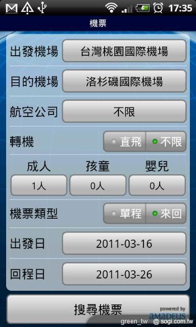 行動機票:與全球最大的航空訂位系統公司 - Amadeus(www.amadeus.com)所合作開發的「行動機票 Mobile Flight」軟體,由多家知名旅行社提供開票服務,可即時搜尋機位及(含稅)票價,並且以日曆方式顯示出發日及回程日前後各三天的最低票價,讓使用者無需四處比價,即可輕鬆預訂最便宜的航班。目前支援 iOS 3.1.2 及 Android 2.1 以上的版本。