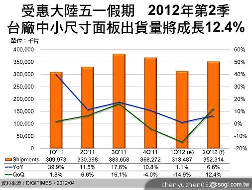 ▲ DIGITIMES Research:受惠大陸五一 2Q'12台廠中小尺寸TFT LCD出貨量季成長12.4%